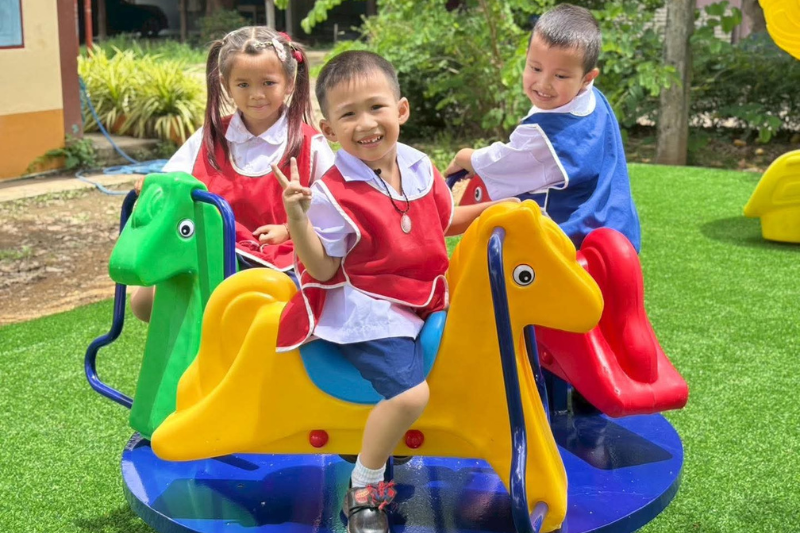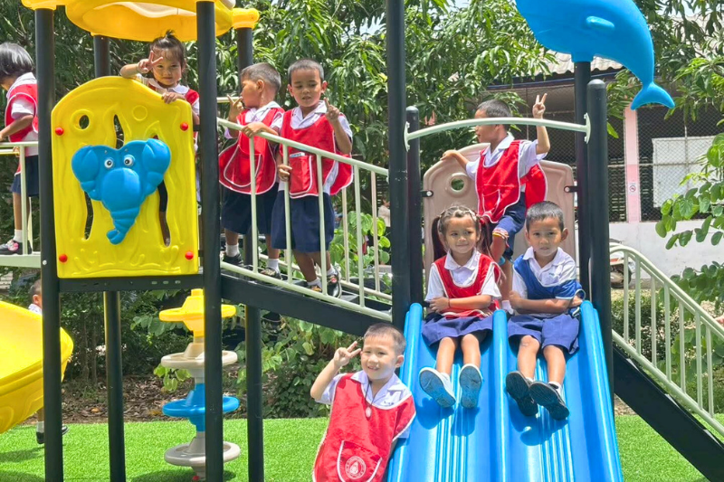 The playground was designed to meet key goals of Thailand’s Early Childhood Education Curriculum B.E. 2017, which emphasizes experiential learning as a core element of child development. This new space provides a secure and engaging environment where students can build essential physical, cognitive, and social skills through play.